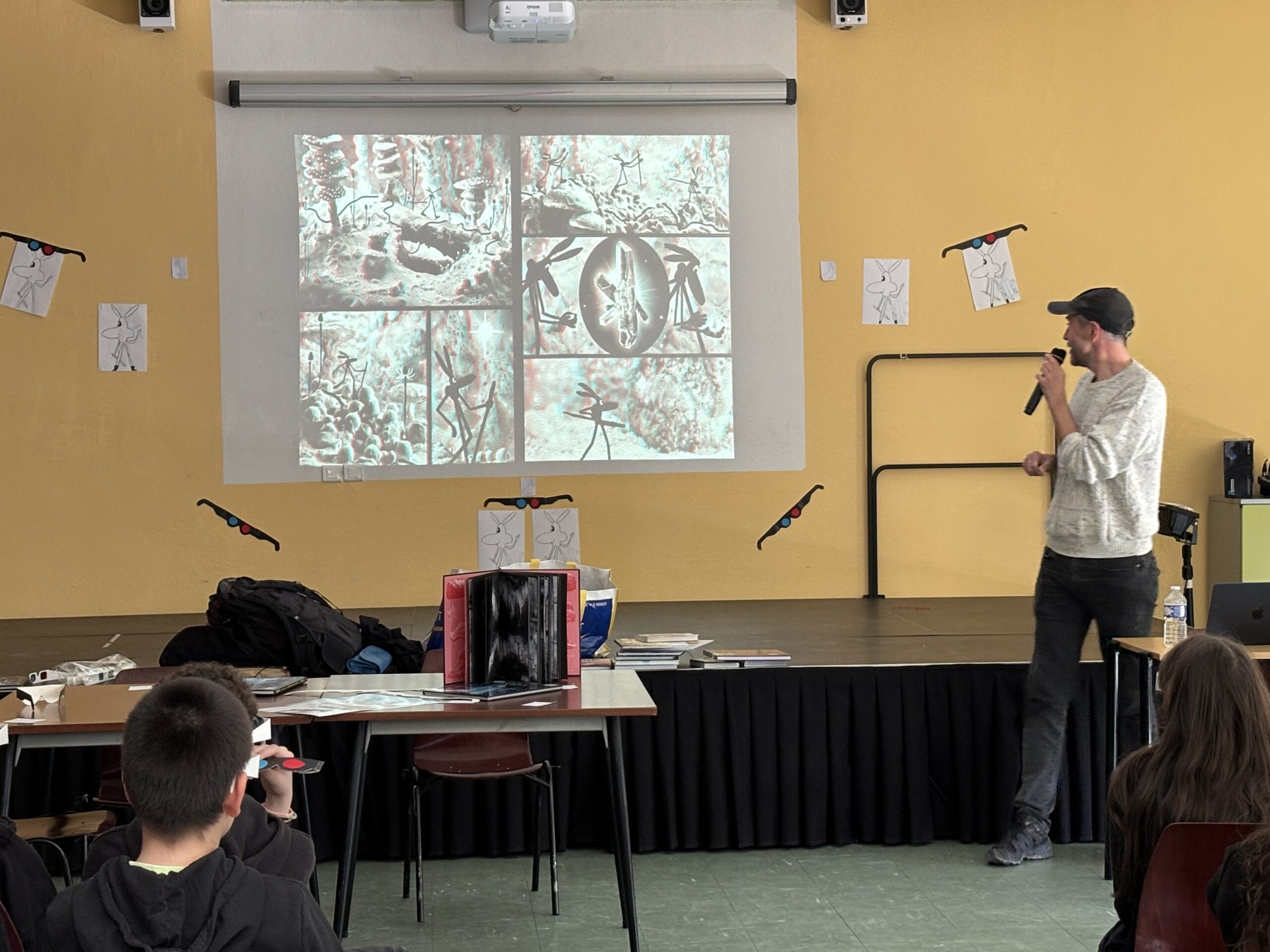 Le livre, une bande dessinée en 3D, avait, dès le début, beaucoup intrigué les élèves. Comment l’auteur avait-il eu l’idée de ce livre ? Pourquoi la 3D ? Comment crée-t-on un livre en 3D ? C’est donc avec beaucoup de joie et de curiosité que les 6èmes attendaient cette rencontre.
