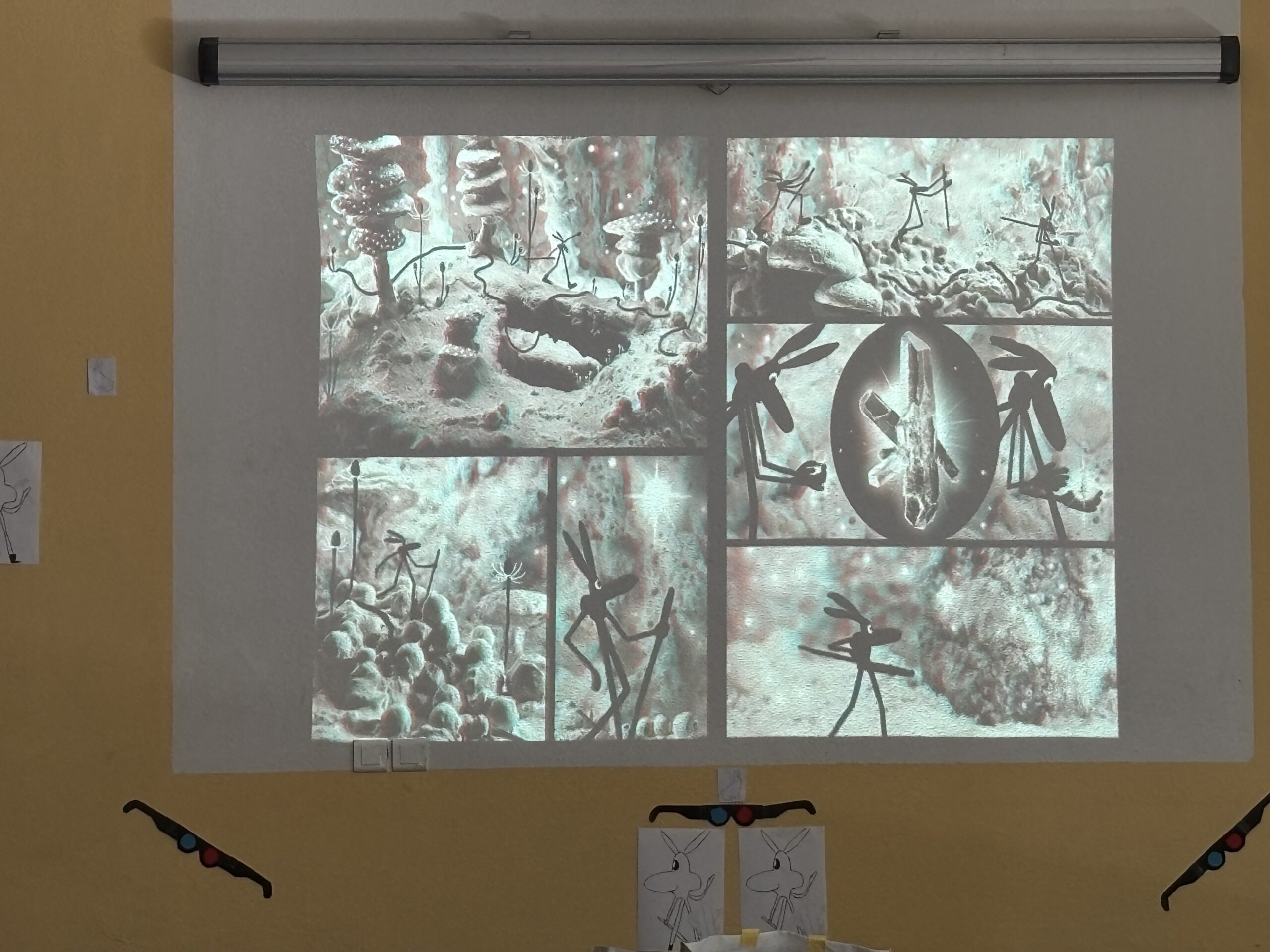 Matthias PICARD a pris le temps de répondre à toutes nos questions et nous a expliqué comment il a créé ce livre étrange. Si Jean Jambe a tout simplement été dessiné, l’auteur a aussi utilisé des techniques plus originales : par exemple, des photographies macro de divers spécimens issues du muséum d’histoire naturelle d’Aix en Provence (corail, calcite, quartz…) et des décors en plâtre pour mettre en scène les paysages du livre. La dimension immersive de la BD a été rendue possible par la technique de l’anaglyphe qui crée l’effet 3D. Un vrai travail d’orfèvre…