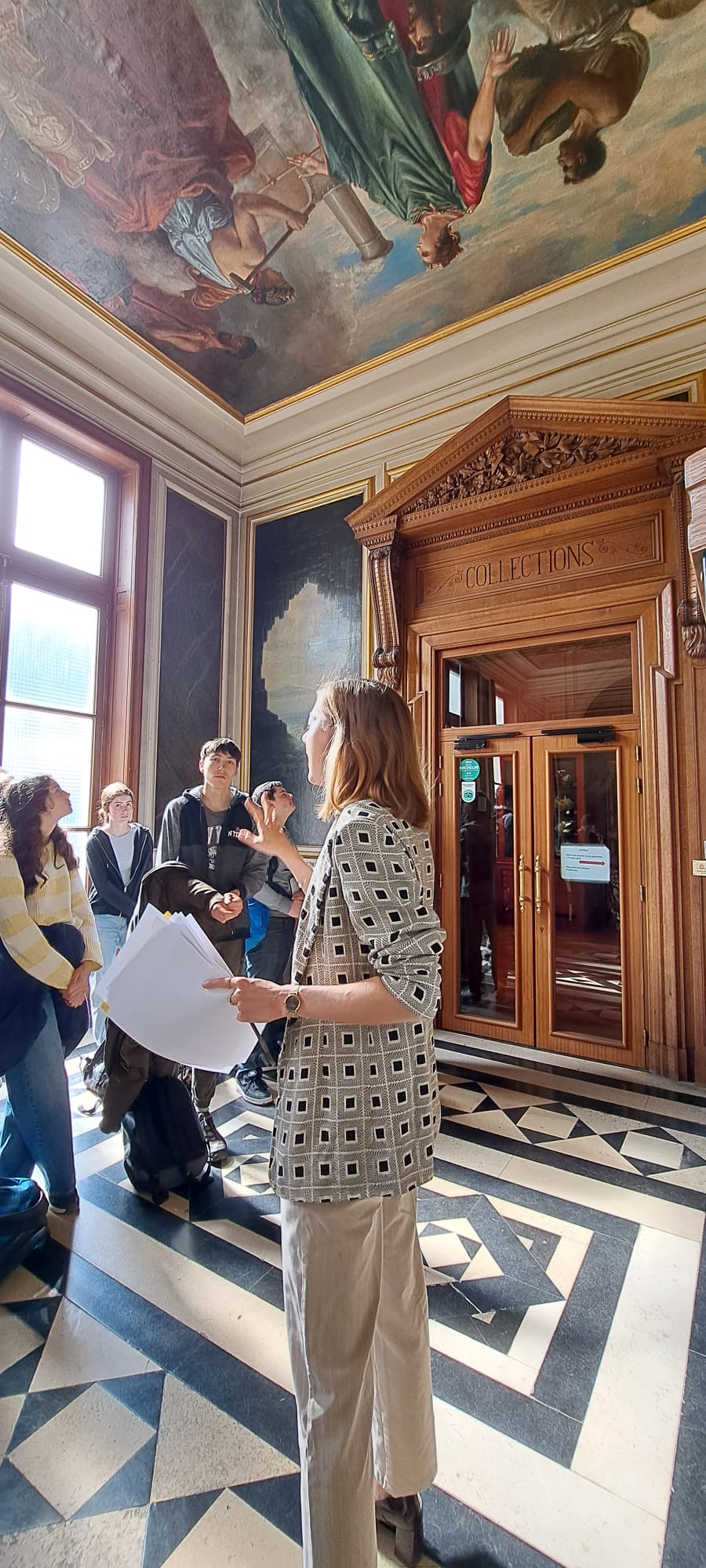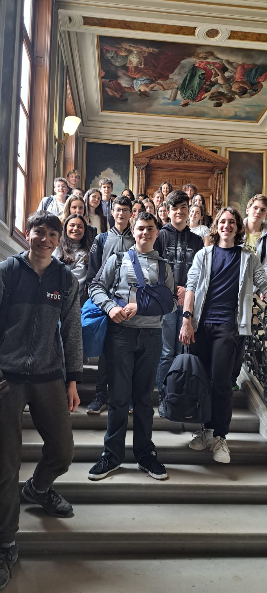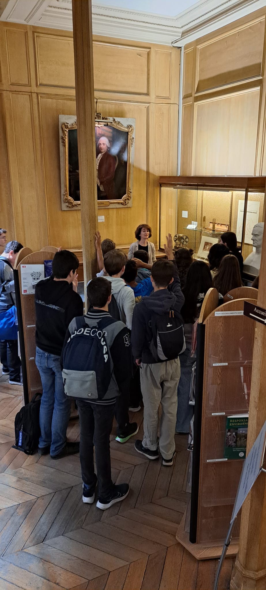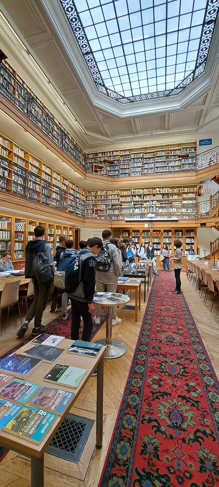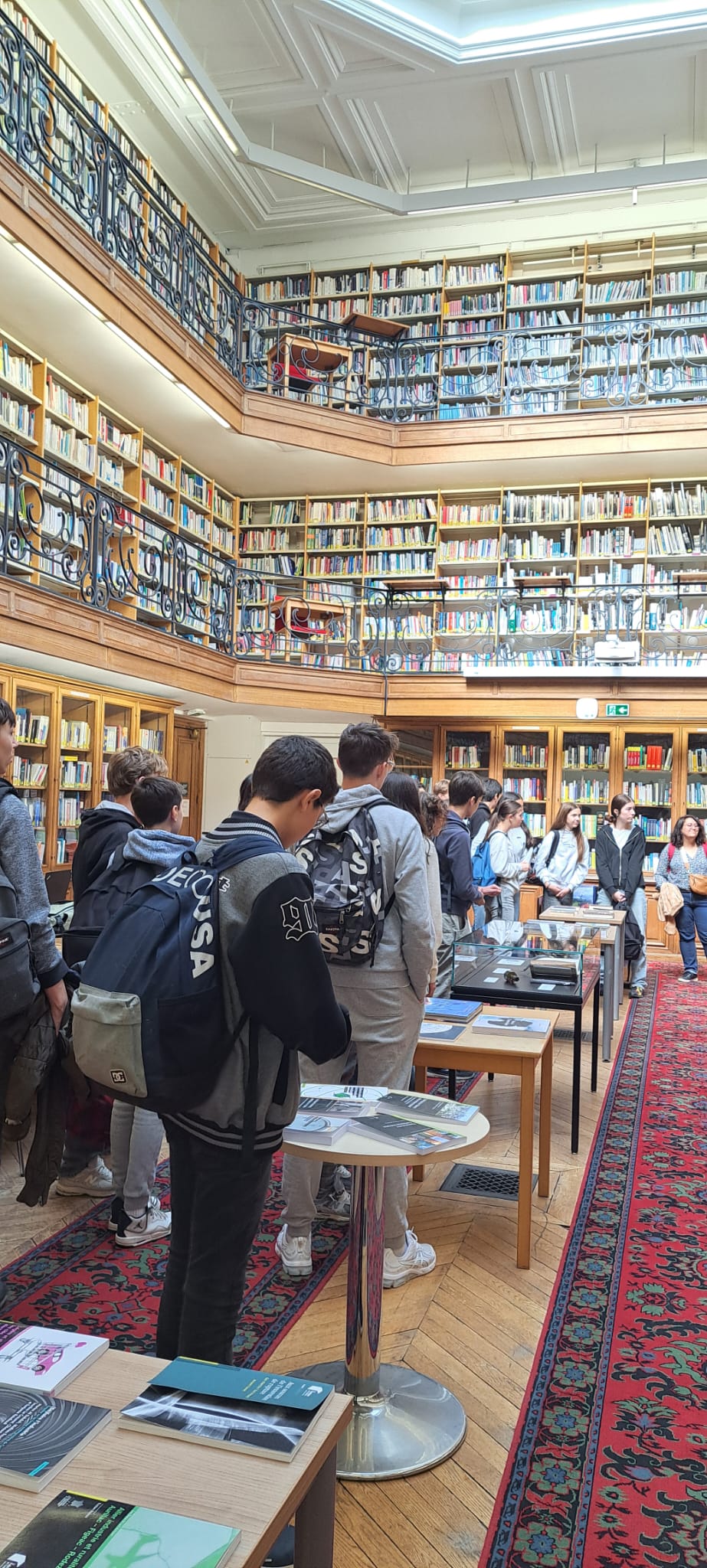 Les élèves se sont ensuite rendus dans la magnifique bibliothèque de L’école et ont été pris en charge par Mme Dessens. Elle leur a expliqué que les étudiants, chercheurs, professeurs utilisaient cette bibliothèque pour leurs recherches mais aussi leur loisir. Ils ont également pu découvrir une exposition sur la cartographie à l’école et voir comment s’est développée la réalisation des cartes et les transformations géométriques que cela implique. Elle leur a aussi parler de la géodésie, la science qui permet de mesurer et de comprendre avec précision la forme géométrique de la terre.
