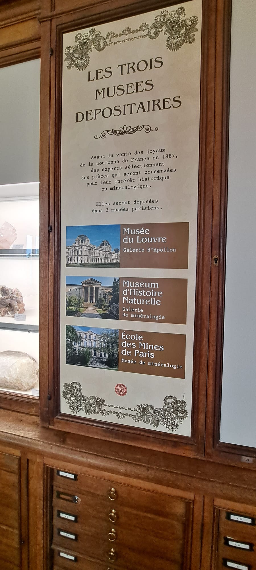 Fondé en 1794, le musée est l’héritier des collections de l’École royale des Mines et abrite une collection de 100 000 échantillons, dont 5 000 sont exposés en vitrine. C’est un patrimoine scientifique unique. C’est l’une des plus grandes et plus belles collections mondiales de minéraux, météorites et de gemmes, notamment les joyaux de la couronne.