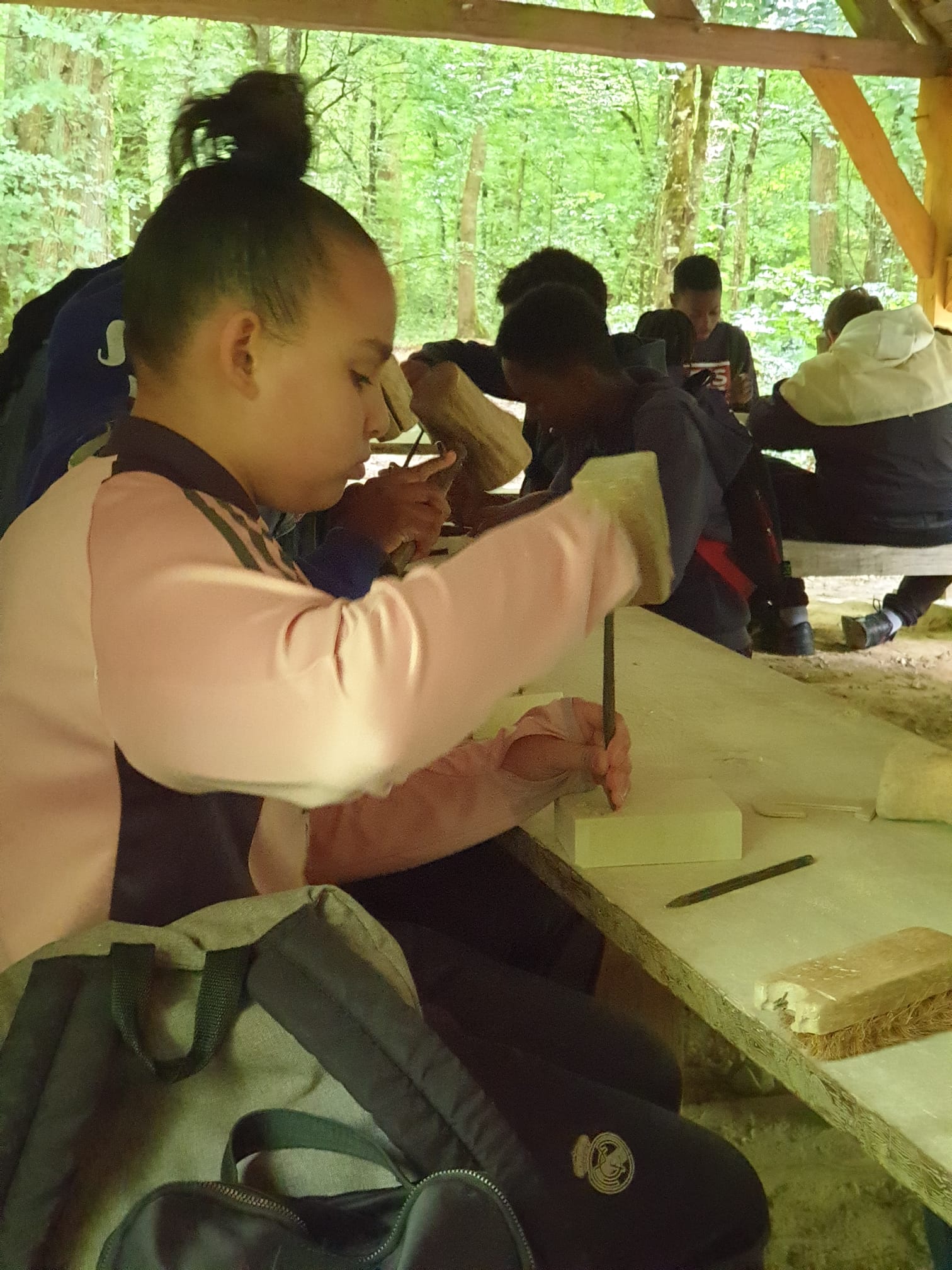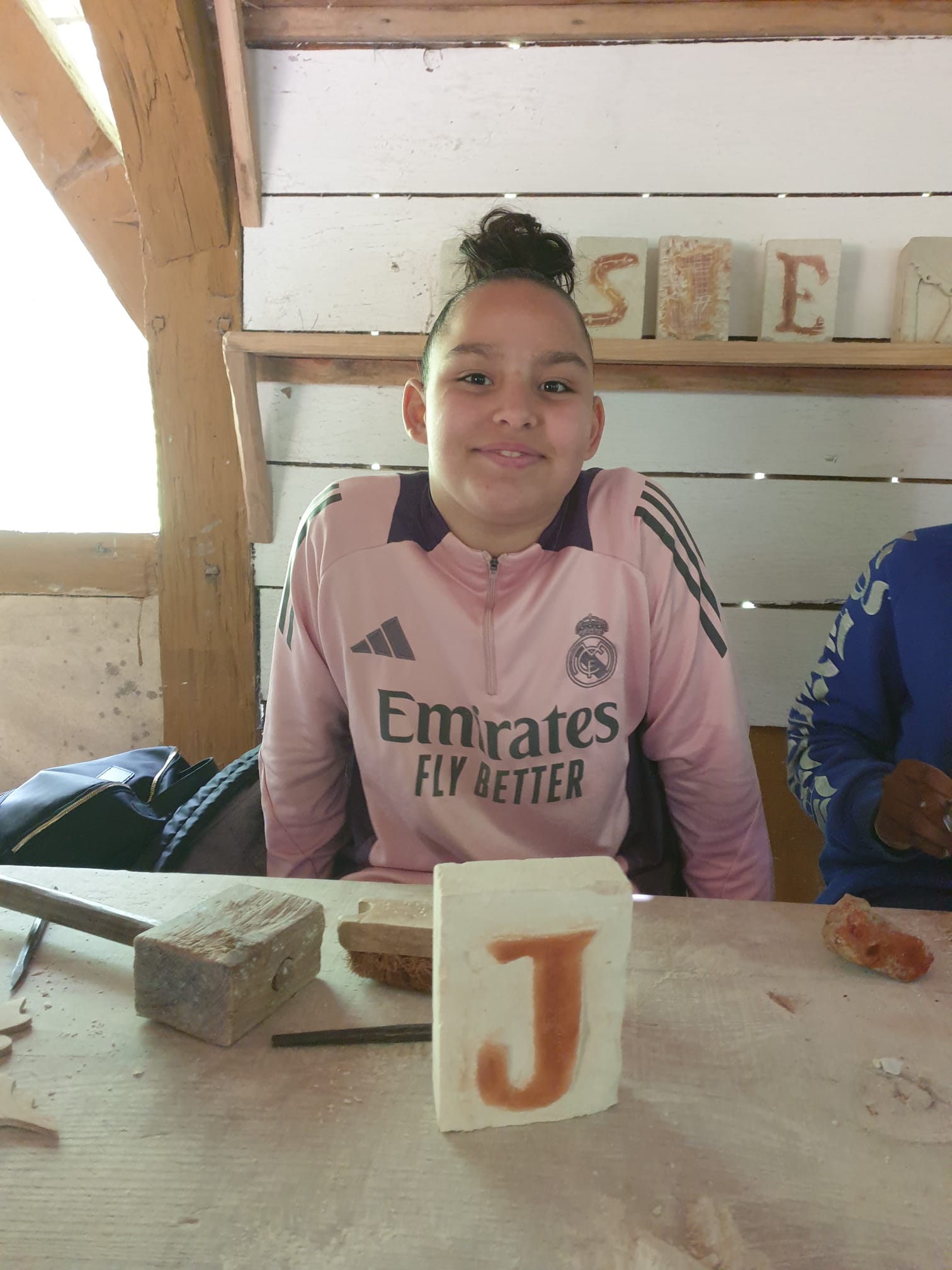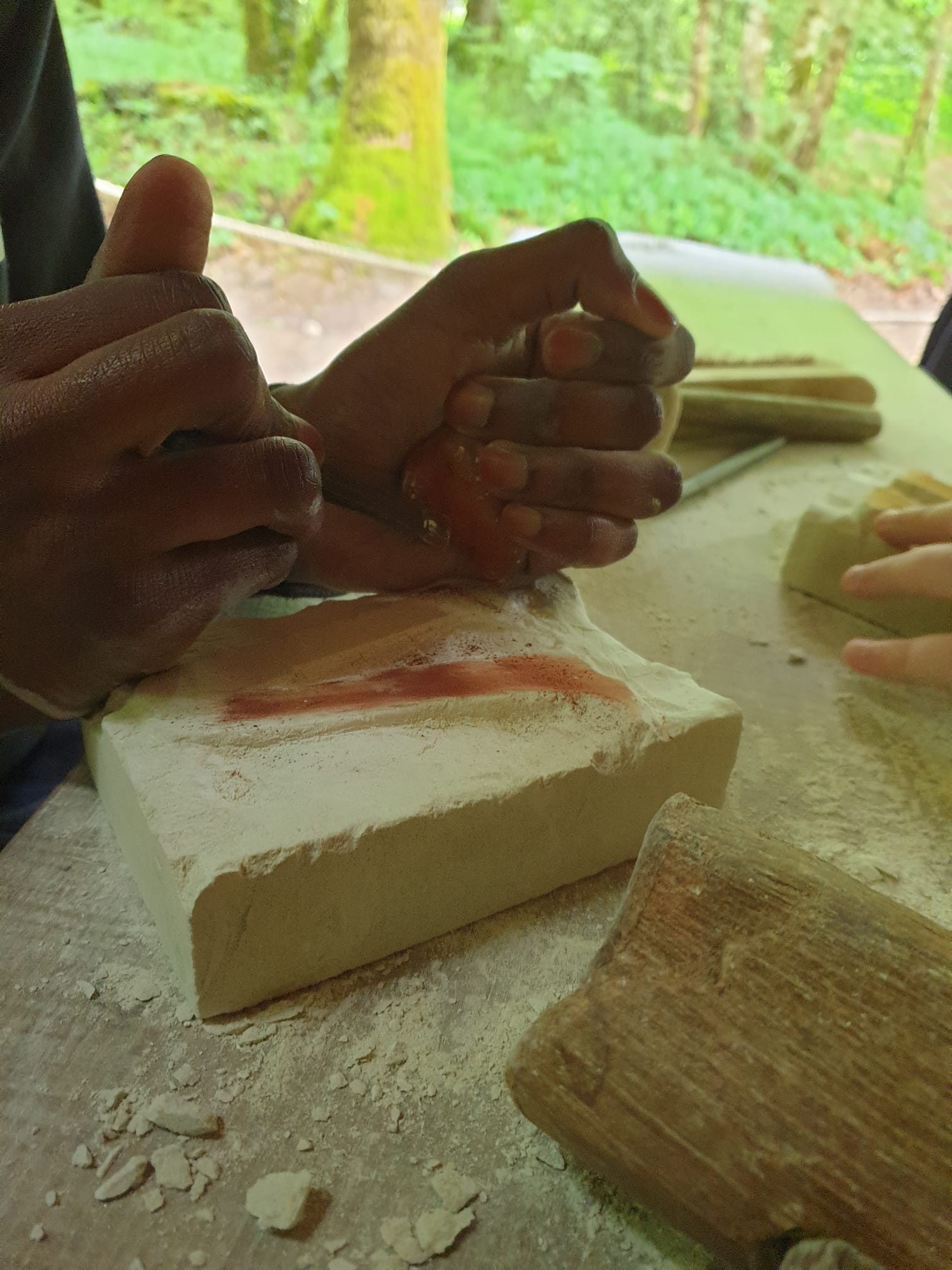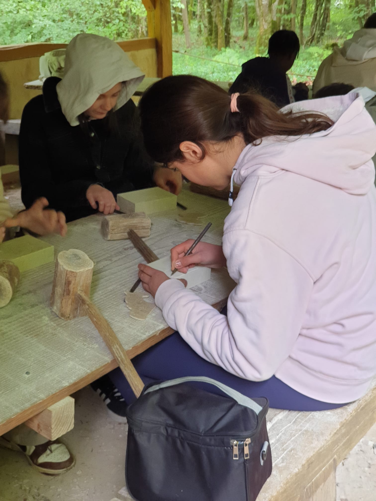 Le premier temps fort de la journée fut la participation à un atelier de taille de pierre, appelé tuffeau. Encadrés par une artisane spécialisée, les élèves se sont initiés aux gestes précis du tailleur de pierre. Munis d’outils traditionnels (pointe, ciseau, marteau), ils ont appris à tracer, sculpter et façonner un motif sur un bloc de calcaire tendre, découvrant ainsi la technicité et la créativité exigées par ce métier. Les plus avancés ont également coloré leur bas relief avec des pigments rochaux jaunes ou rouges, présents sur le site du château. Chacun a pu repartir avec sa propre sculpture, fièrement réalisée, en souvenir de cette expérience unique.