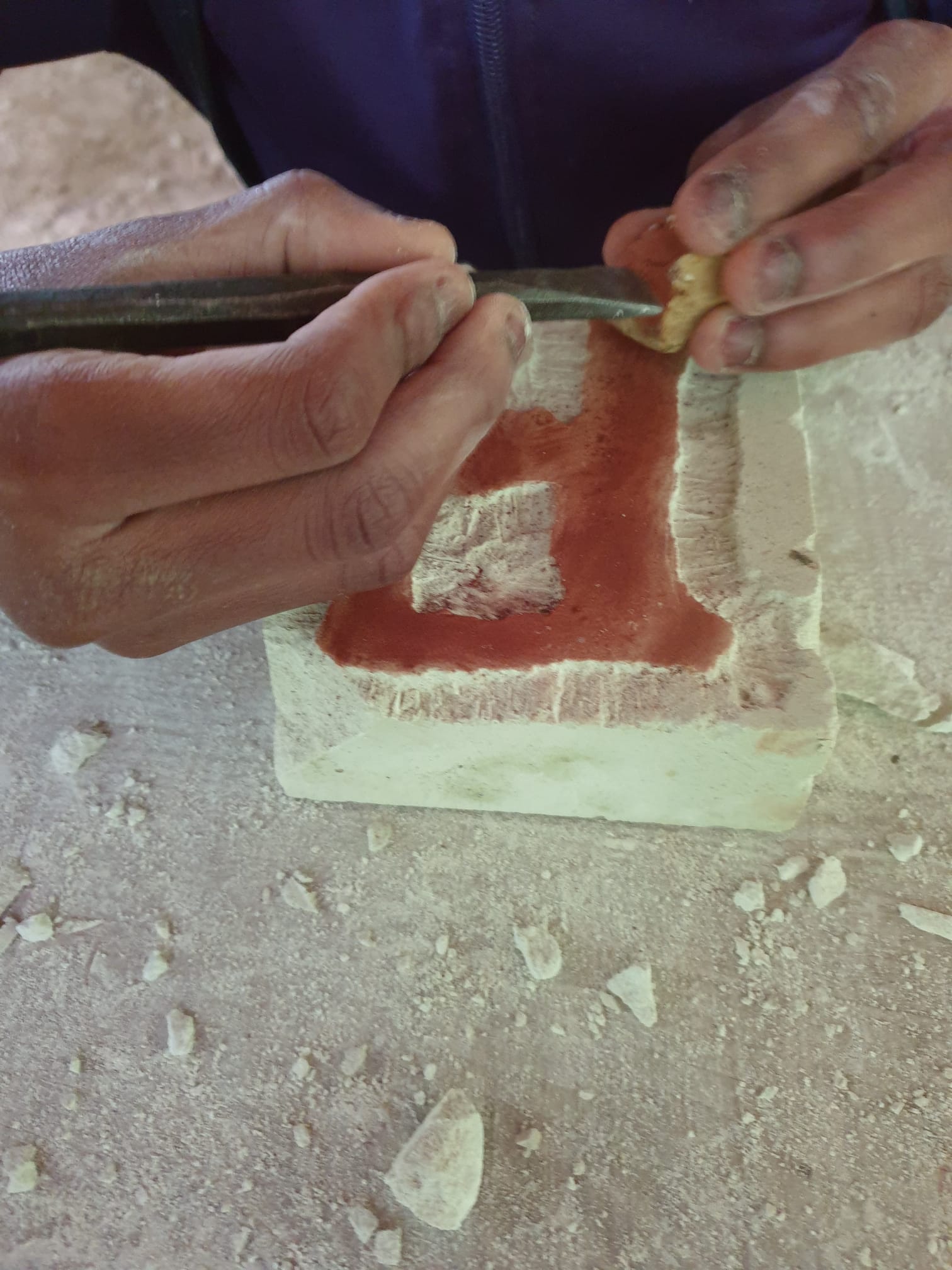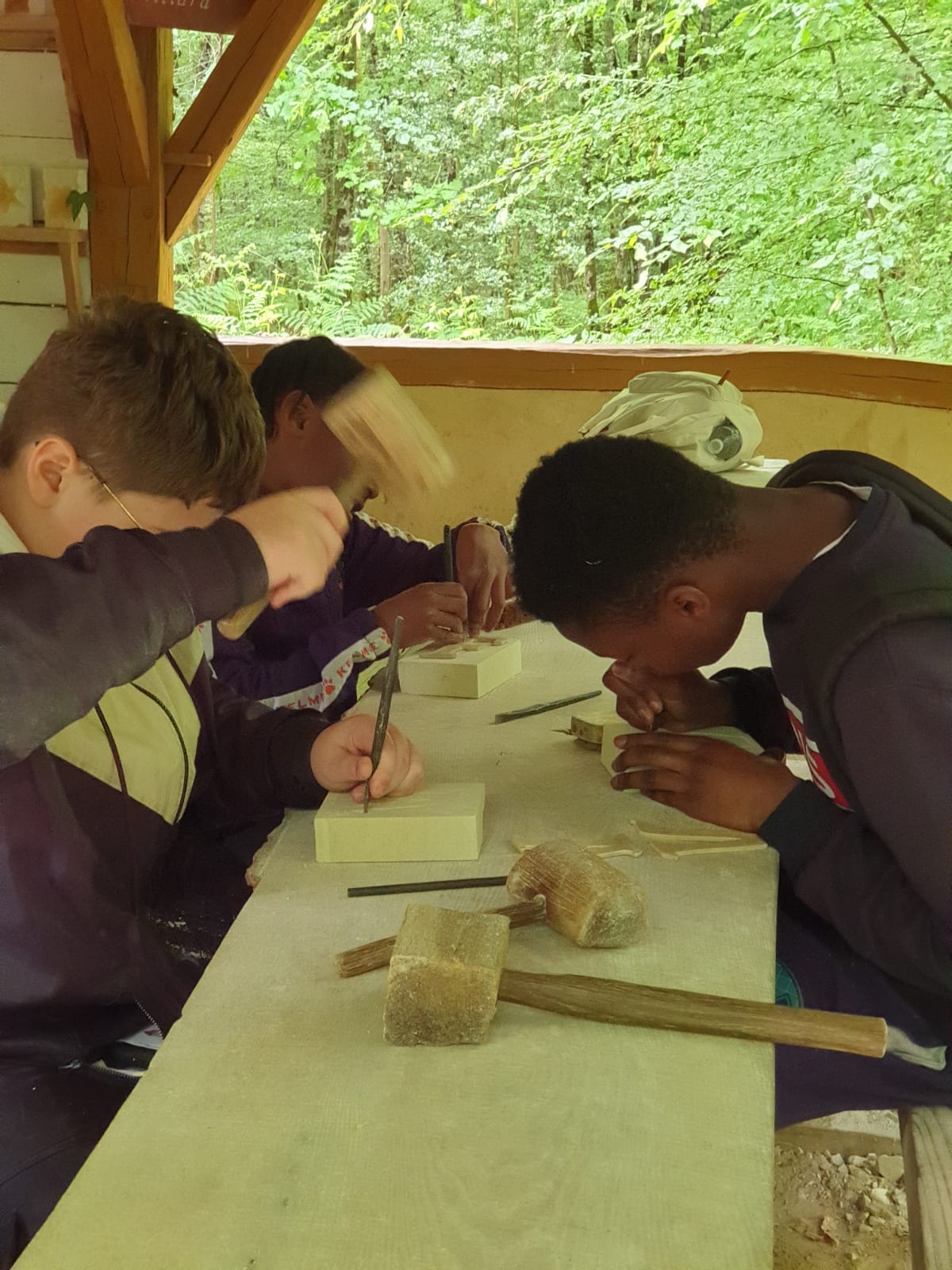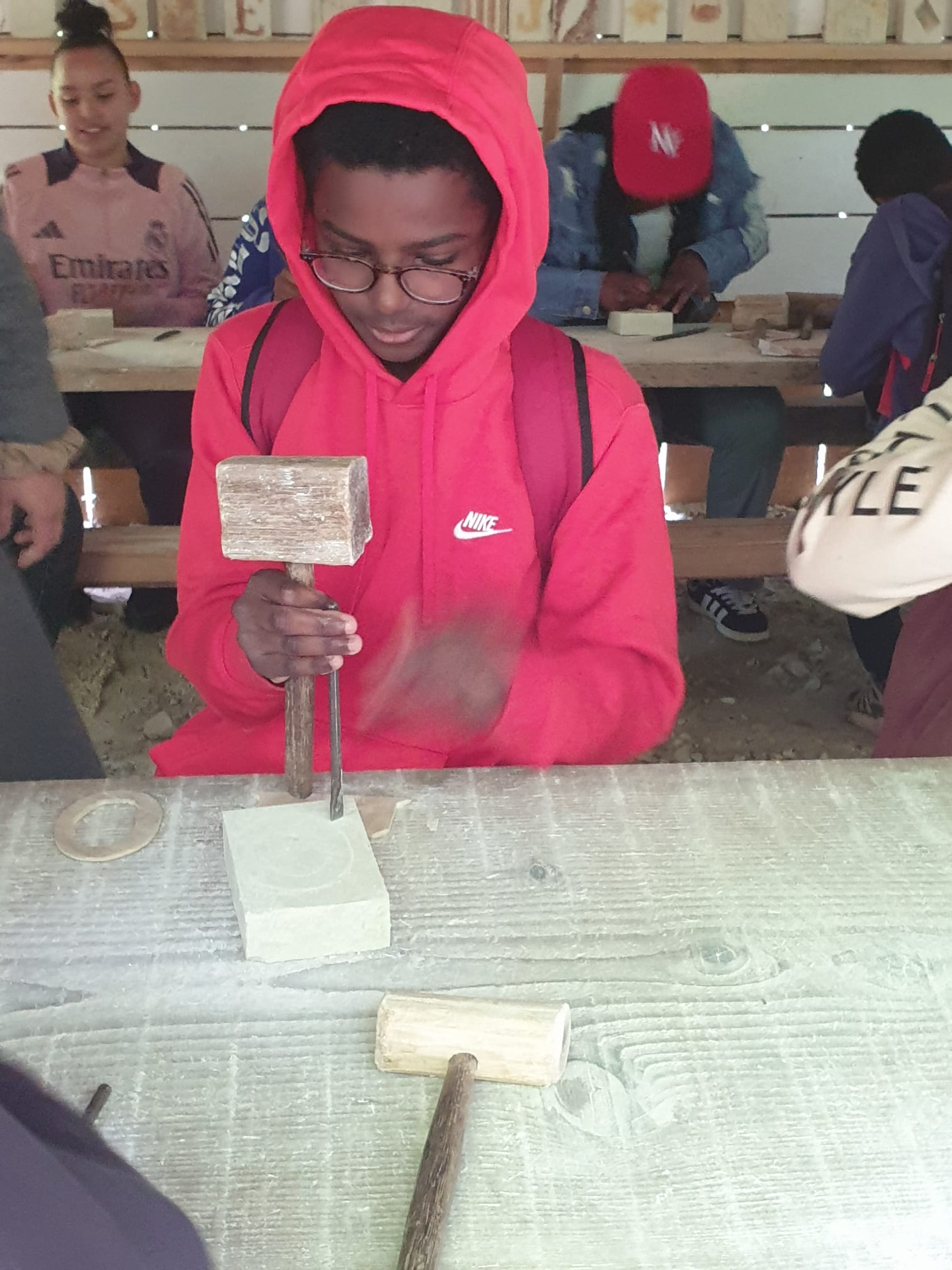 Le premier temps fort de la journée fut la participation à un atelier de taille de pierre, appelé tuffeau. Encadrés par une artisane spécialisée, les élèves se sont initiés aux gestes précis du tailleur de pierre. Munis d’outils traditionnels (pointe, ciseau, marteau), ils ont appris à tracer, sculpter et façonner un motif sur un bloc de calcaire tendre, découvrant ainsi la technicité et la créativité exigées par ce métier. Les plus avancés ont également coloré leur bas relief avec des pigments rochaux jaunes ou rouges, présents sur le site du château. Chacun a pu repartir avec sa propre sculpture, fièrement réalisée, en souvenir de cette expérience unique.