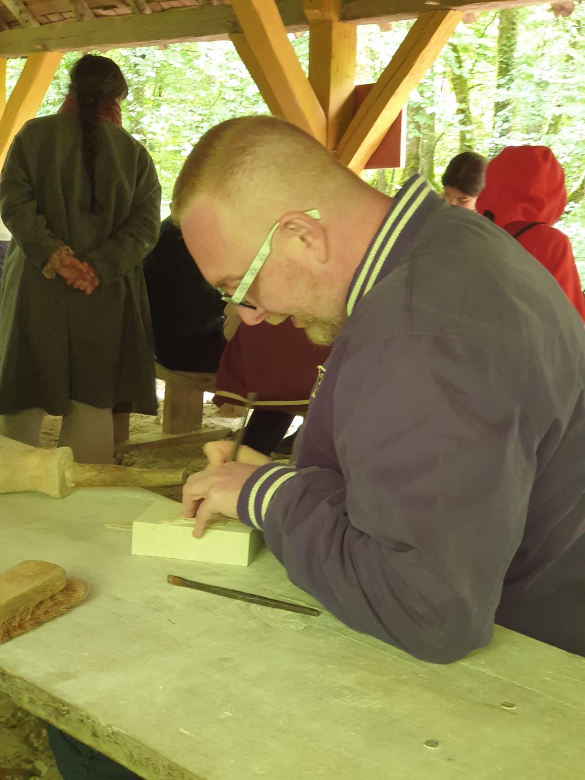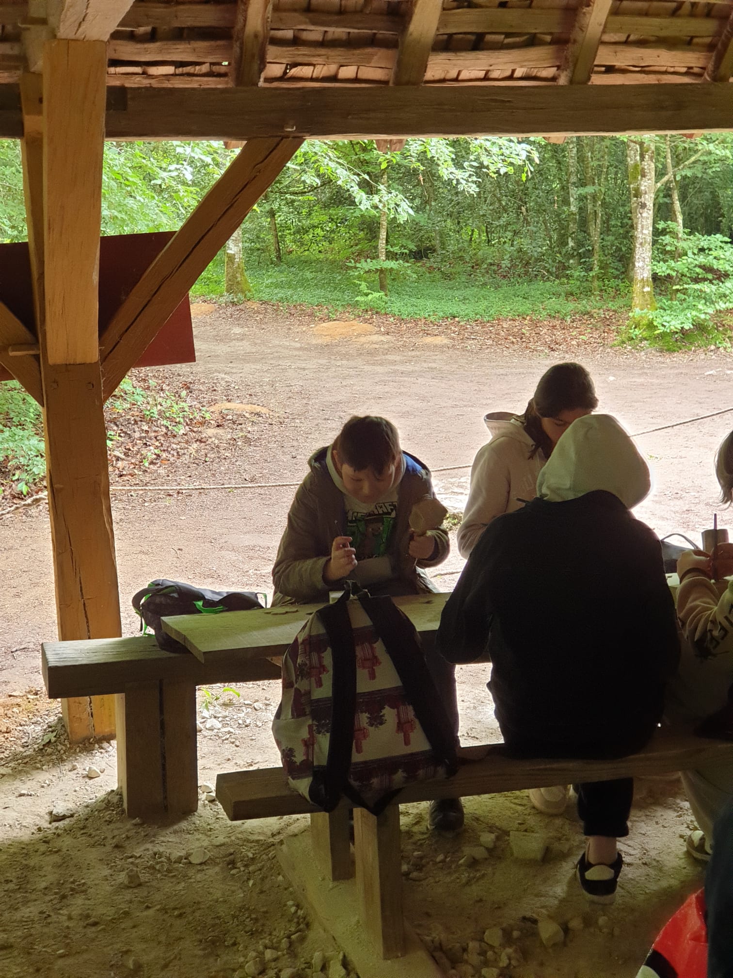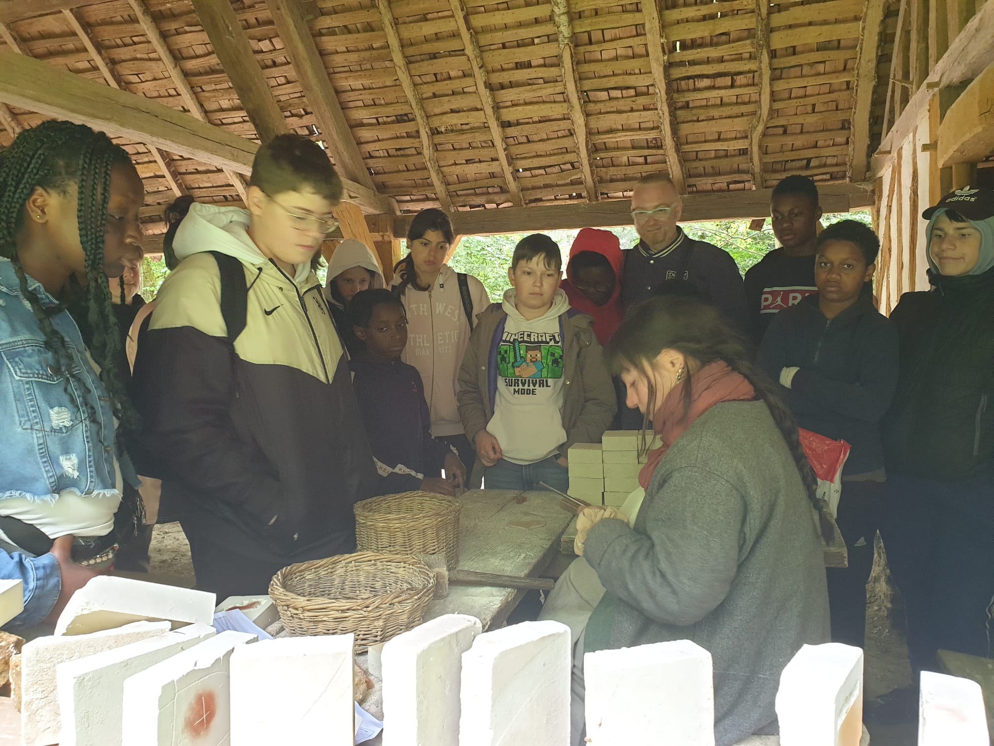Après cet atelier et un déjeuner roboratif, les élèves ont eu la possibilité de circuler librement sur le chantier, véritable village médiéval animé par une quarantaine d’artisans : tailleurs de pierre, maçons, charpentiers, forgerons, potiers, cordiers, teinturiers, peintres… Ils ont pu observer leur travail, poser de nombreuses questions et comprendre l’importance de chaque savoir-faire dans la construction et la décoration du château. Cette proximité avec les artisans a offert aux élèves une plongée vivante dans l’histoire et les métiers d’autrefois.