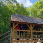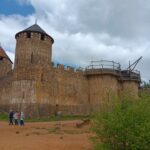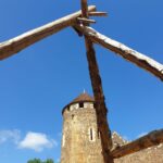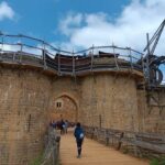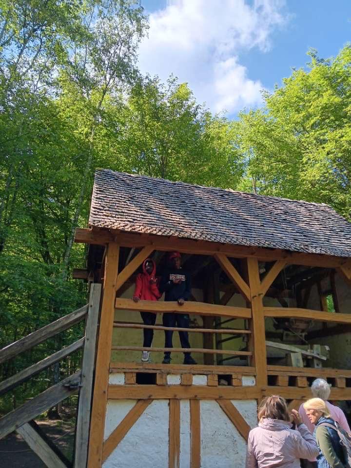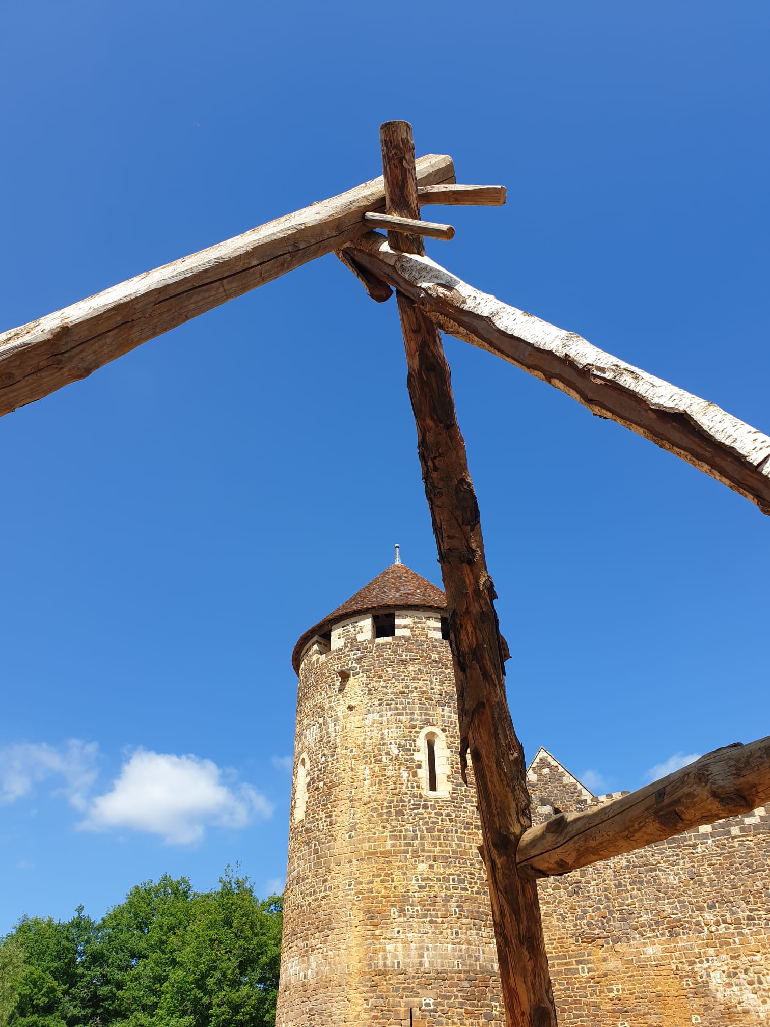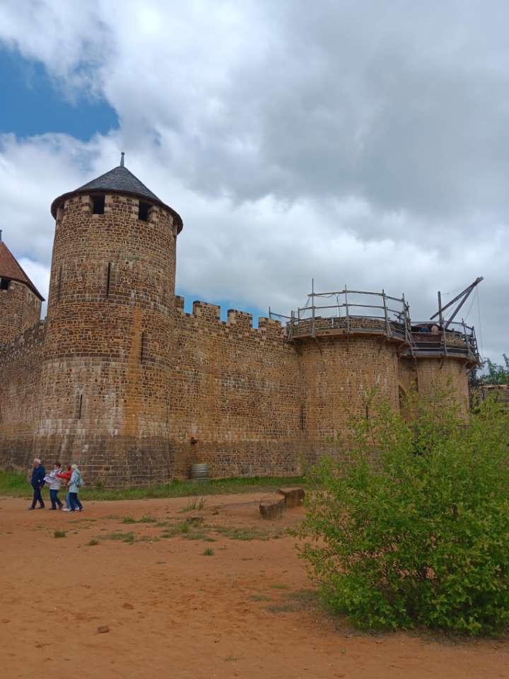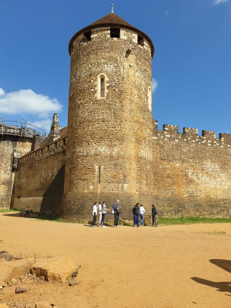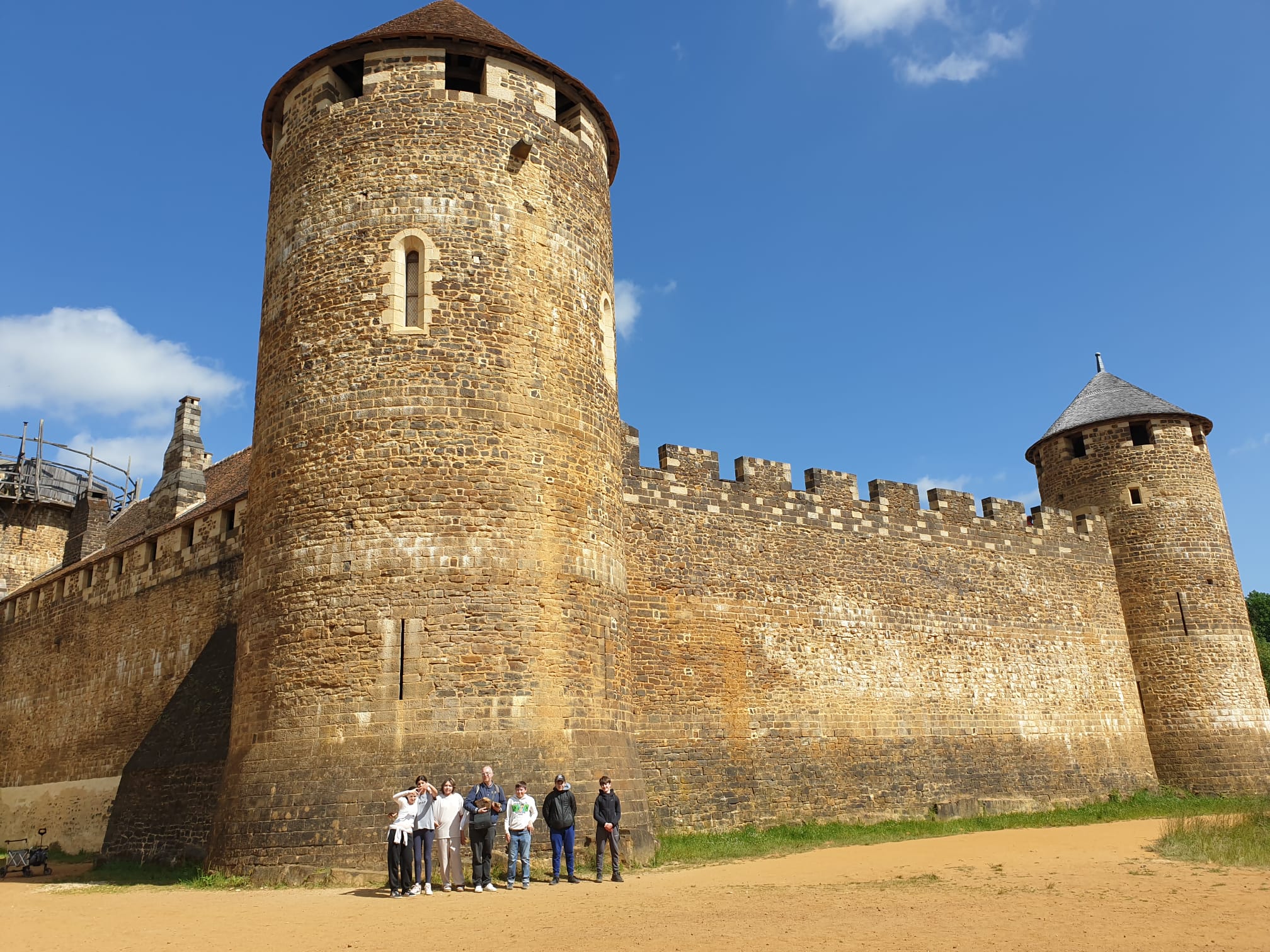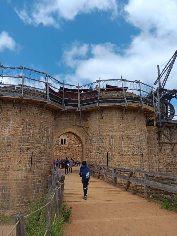 En parallèle de ces échanges, les élèves sont partis à la découverte du château lui-même, dont la construction a débuté en 1997 et se poursuit encore aujourd’hui, sous les yeux des visiteurs. Le guide qui les a reçu au début de la journée leur a indiqué qu’il y en avait encore une dizaine d’années de chantier avant que le château soit terminé. Les élèves ont exploré les différentes parties de l’édifice : tours, courtines, logis seigneurial, et ont pu constater l’évolution du chantier, pierre après pierre, notamment au-dessus du pont-levis. Cette observation directe leur a permis de mieux comprendre les difficultés et les engins et techniques employés (grue à cage écureuil, compas, archipendule…) à l’époque médiévale.