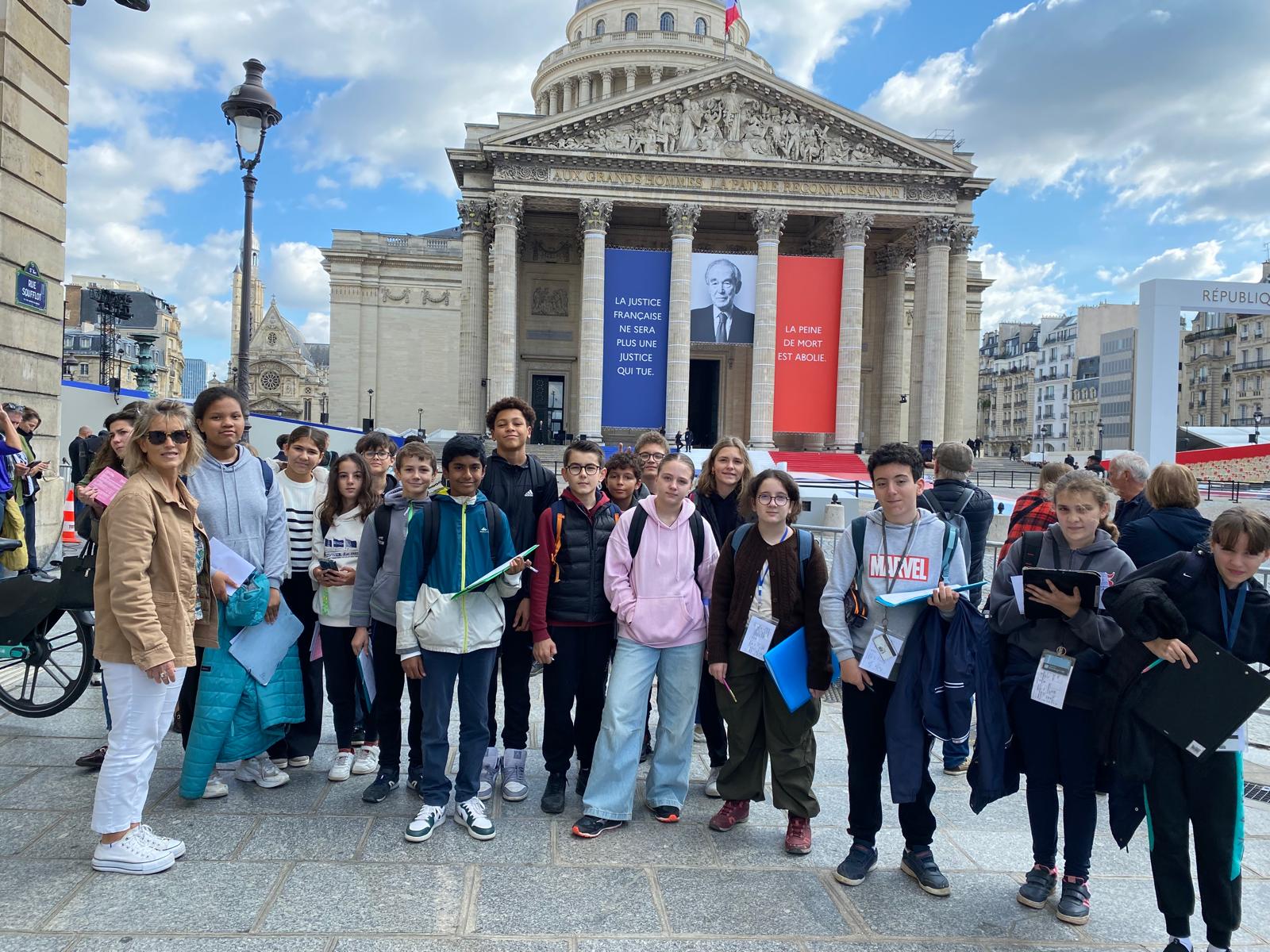 Après un pique-nique convivial dans le jardin des Tuileries, le groupe a poursuivi la journée dans le Quartier Latin. Première étape : les thermes de Cluny et la célèbre Louve capitoline, au square Samuel Paty, symbole de la fondation de Rome. Puis, les élèves ont emprunté l’ancien decumanus, la voie romaine qui correspond aujourd’hui à la rue Soufflot. Ce lieu, témoin de l’histoire antique, a aussi une valeur symbolique contemporaine puisqu’il a accueilli la cérémonie de panthéonisation de Robert Badinter.