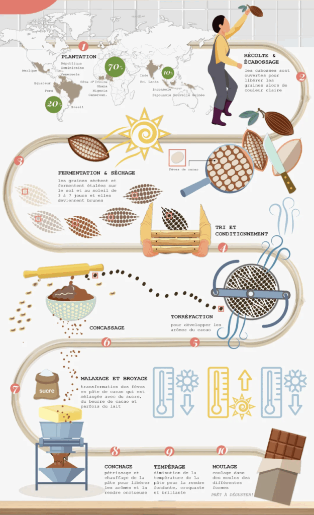 À partir du document présenté en classe, M. SAUSSEREAU a détaillé les grandes étapes : récolte des cabosses, fermentation, séchage, torréfaction, concassage, puis malaxage avec le sucre, conchage, tempérage et moulage. Les élèves ont découvert que chacune de ces opérations, depuis la ferme togolaise jusqu’à l’atelier du chocolatier, demande du temps, de la précision et des savoir-faire complémentaires.